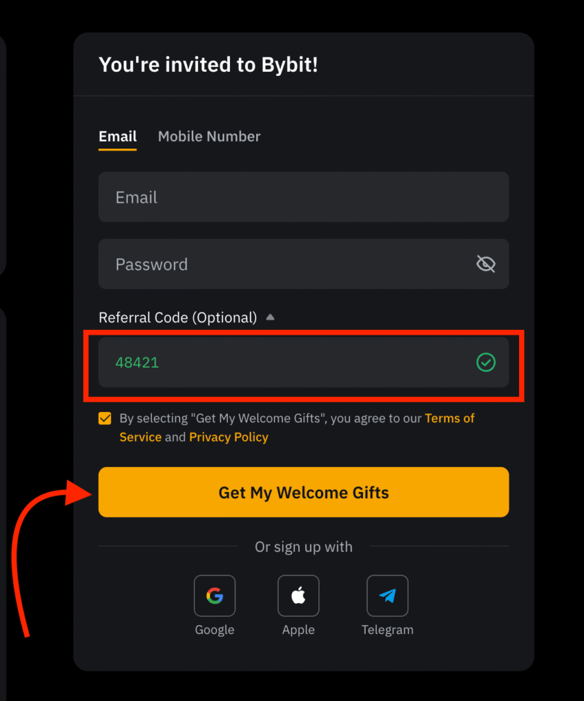 Enter your email or phone number, a strong password, and agree to Bybit’s Terms of Service and Privacy Policy. Suppose the referral code 48421 isn’t filled in automatically. In that case, you can enter it here for your extra rewards and click Get My Welcome Gifts.